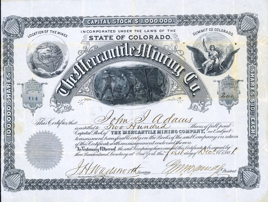 THE MERCANTILE MINING COMPANY, stock certificate #114, issued December 1, 1881, uncancelled.  For mining property located on Elk Mountain, Ten-Mille District, Summit County, Colorado.  Very good plus condition.