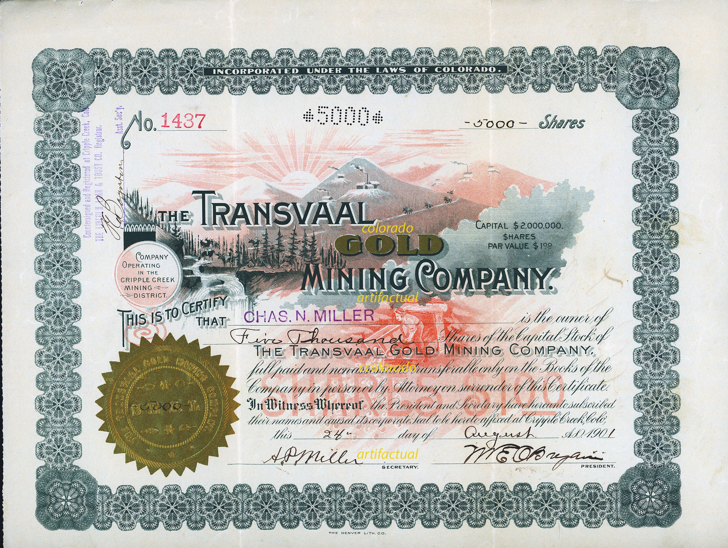 Certificate was printed by The Denver Litho Company